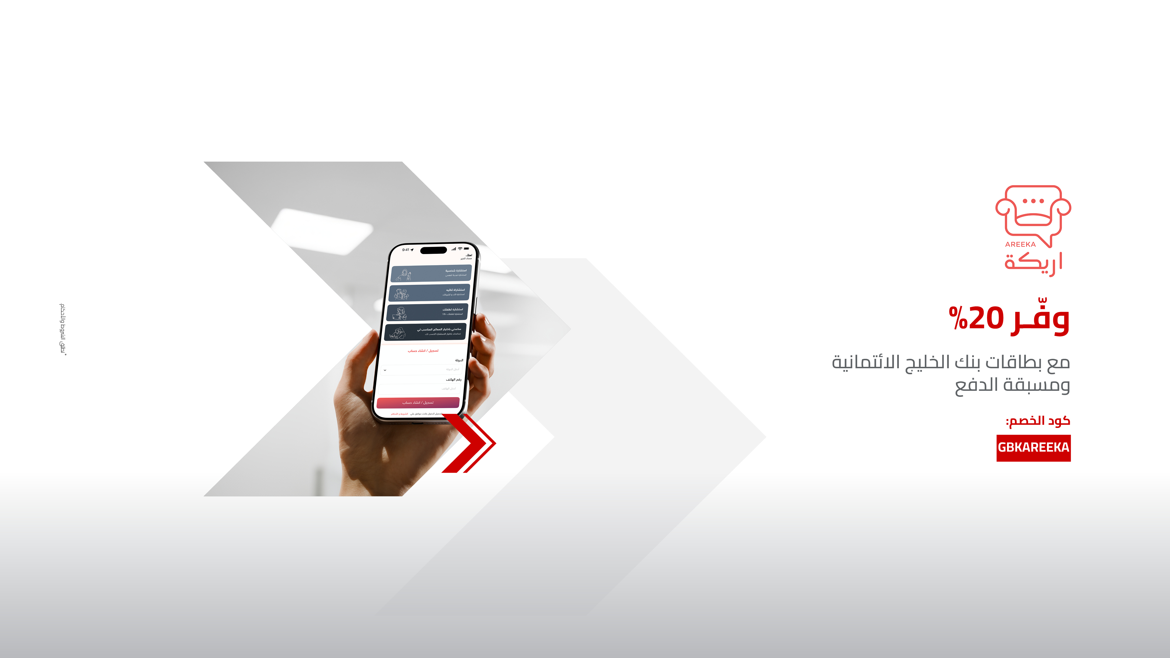 • يحصل حاملي بطاقات بنك الخليج الائتمانية ومسبقة الدفع على خصم 20% عبر تطبيق "أريكة" عند استخدام بطاقة بنك الخليج الائتمانية ومسبقة الدفع وادخال الرمز الترويجي عند الدفع.