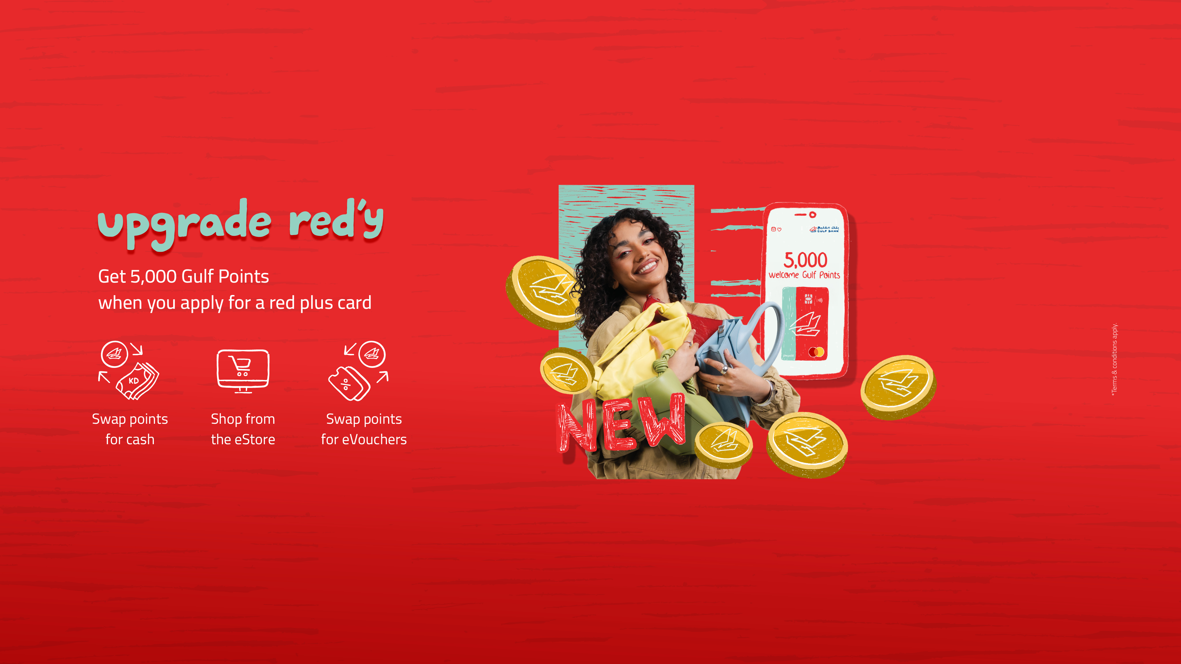 With every transaction you make using the Gulf Bank red. plus prepaid card, you can earn valuable points that can be redeemed through the online store, converted into cash, or transferred to other Gulf Bank customers as a gift.