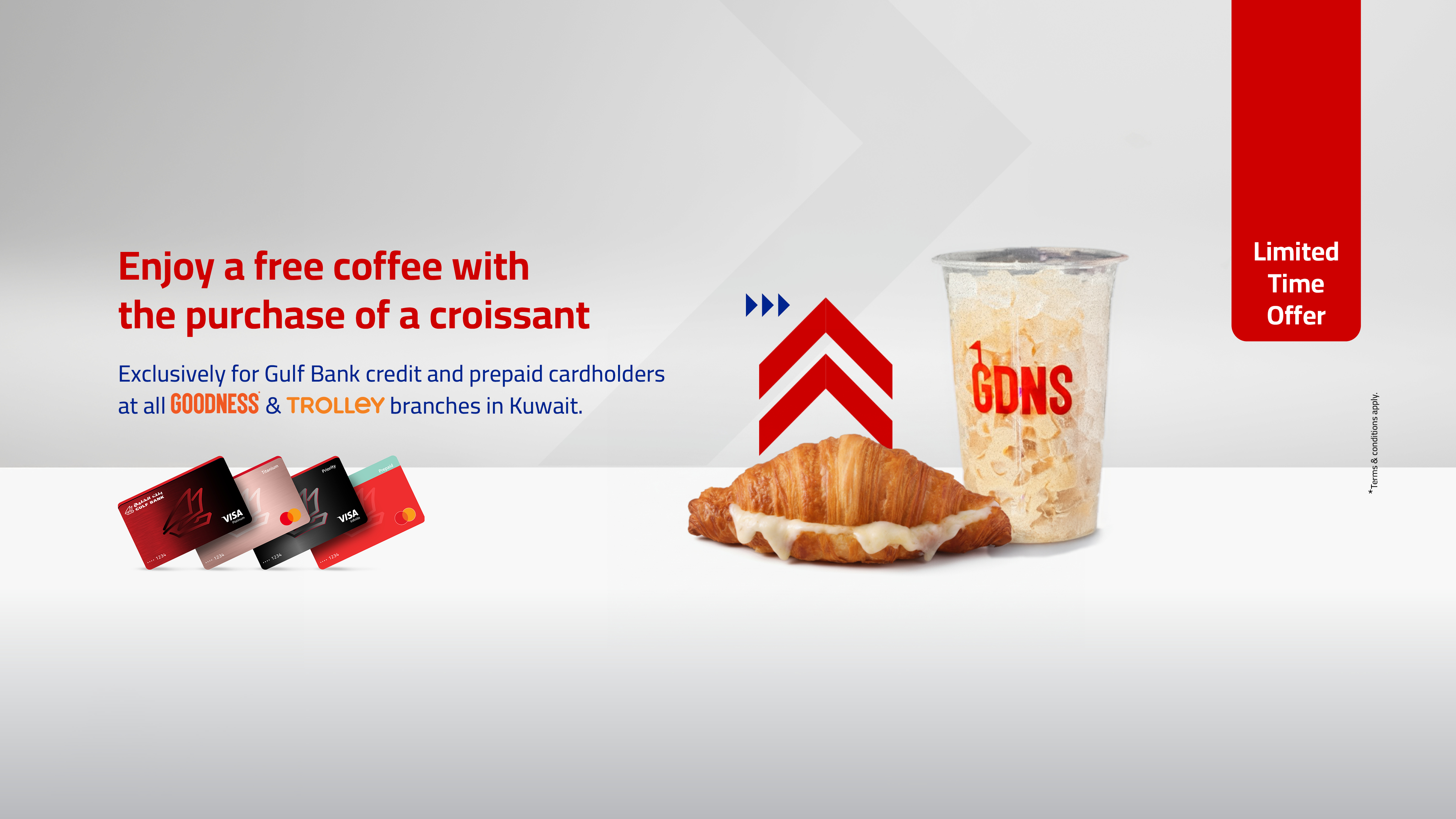 Gulf Bank Credit & Prepaid cardholders can enjoy a free coffee with every croissant purchase.